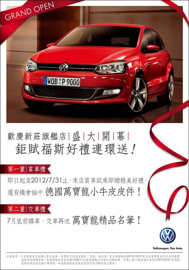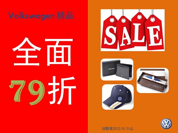 慶祝新莊旗艦店盛大開幕,鉅賦福斯獨家獻優惠,Volkswagen精品全面79折,限時限量熱烈搶購中,活動僅到2012/8/31止,請把握最後機會喲!