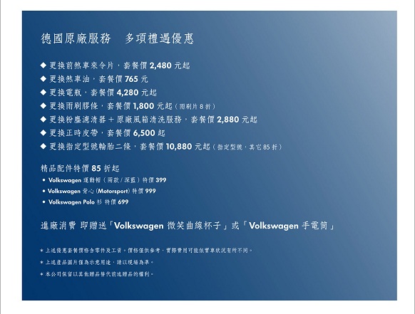 「前進龍年 榮耀分享」新春健檢活動期間,只要車主進廠消費不限金額,即可獲贈Volkswagen 微笑曲線杯子(一個);此外,輪胎與冬季服飾、帽子精品,全面85折優惠回饋車主。