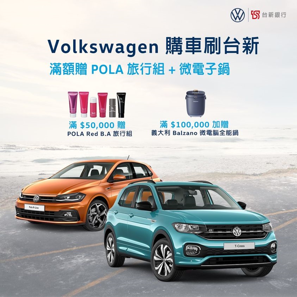 於全臺福斯汽車授權經銷商購車,刷台新信用卡支付訂金滿額現場拿好禮