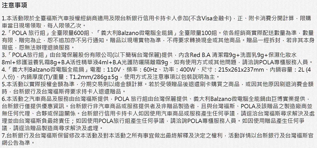 刷玫瑰Giving卡付福斯購車訂金,單筆10萬最高回饋6,000元(6%)+「POLA Red B.A旅行組乙組」+「義大利Balzano微電腦全能鍋」乙個。